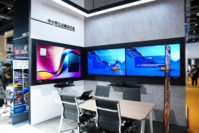 索尼与罗技等会议生态合作伙伴一起共同打造中小型会议室系统,现场展示双屏与单屏两种方案,均可以通过内置的腾讯会议Rooms应用程序或合作伙伴的会议外设,轻松快速召开会议。近年来,公司与会议生态合作伙伴紧密合作,不断完善产品和方案,为客户提供更完整、更便捷、易维护的整体解决方案。在环境明亮或者需要开灯的会议中,防眩大师系列可以呈现清晰无眩光的内容,从不同角度观看都能获得理想效果。