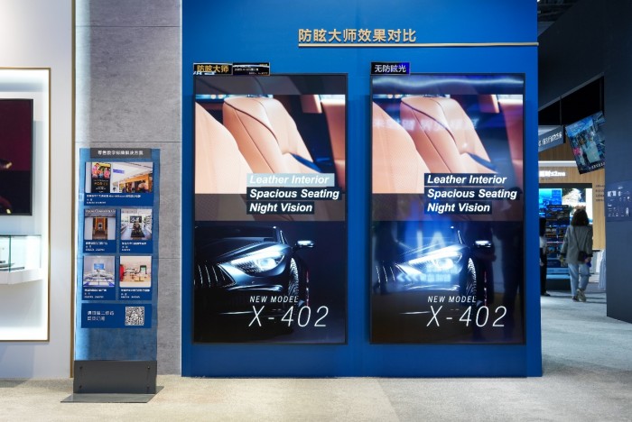 3台98英寸防眩大师系列商显旗舰机型FW-98BZ53L拼接形成一块超宽巨幅画面,在明亮的展厅环境中更好地展现并提升企业形象。现场还布置了98英寸商显的防眩效果对比展示,让观众直观感受防眩大师系列商显与无防眩光功能商显之间的显著差异。