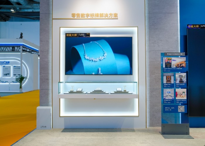 为了更好地展示商品,零售门店会设计相对复杂的灯光,包括照明灯、射灯及装饰光带等。索尼在靠近过道的展区,模拟真实客户珠宝门店场景,通过一台75英寸防眩大师系列商显FW-75BZ40L,配合展示珠宝的光泽与质感,凸显索尼商显零售数字标牌方案的高品质与用户友好特性。展台还展示了机场航显解决方案与演播室、转播台解决方案,通过客户的真实场景呈现卓越且可复制的高品质效果。