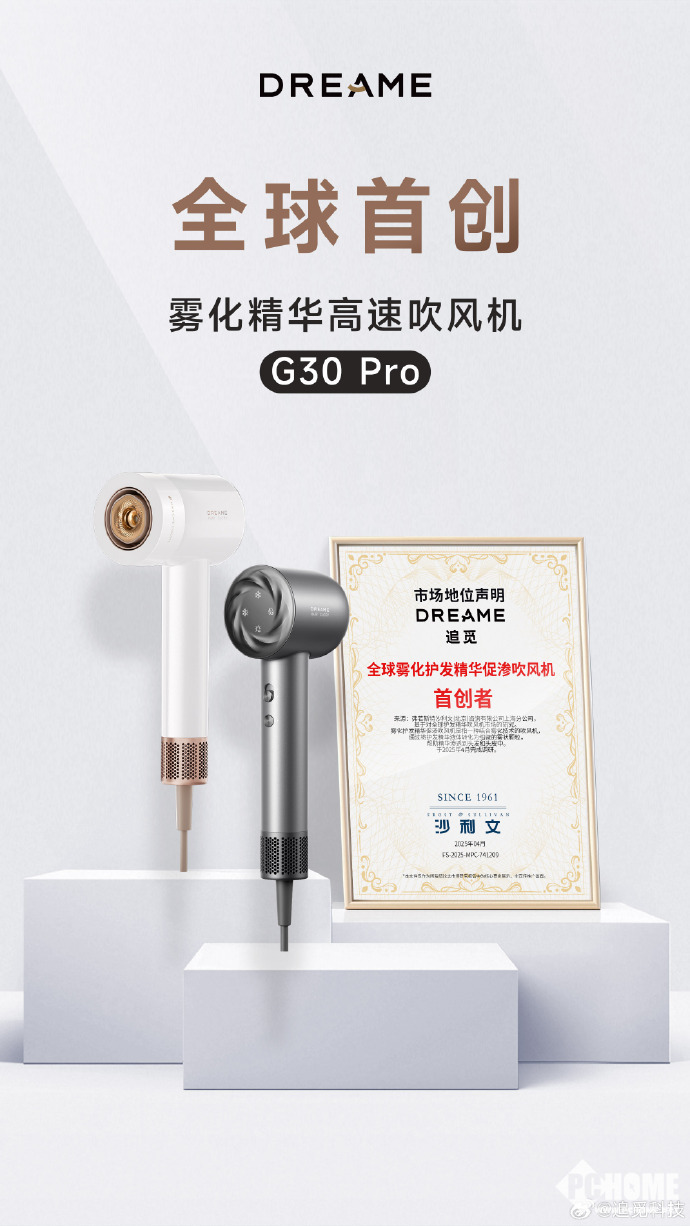4月16号消息,全球知名第三方权威机构沙利文正式出具声明,追觅科技荣获“雾化护发精华促渗高速吹风机”全球首创证书。追觅G30 Pro全球首创雾化精华技术,将精油转化为微米级雾状粒子,为用户带来SPA级的雾化养护。