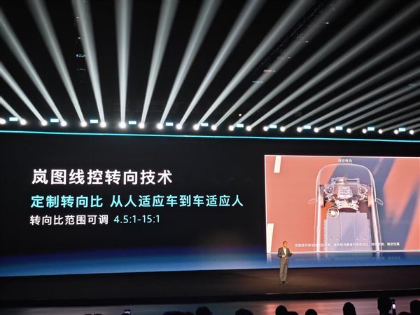 而岚图汽车此次首发的线控转向技术,可实现车辆方向盘与转向机解耦,高度定制化转向比,转向比范围可调4.5:1-15:1,从人适应车进化到车适应人。