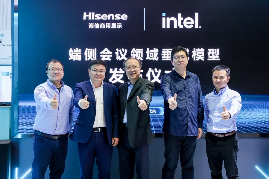 在近日召开的专业视听行业的年度盛会InfoComm China 2025上,英特尔携手海信联合发布海信自研端侧会议领域垂域模型解决方案,助力商务会议更加安全、高效、及时。海信商用显示公司总经理罗勇、海信商用显示公司产品线运营中心总经理张连峰、英特尔客户端计算事业部边缘计算CTO、英特尔客户端计算事业部高级首席AI工程师张宇博士、英特尔中国区销售市场部教育零售医疗行业经理李轩,英特尔中国区销售市场部教育零售医疗行业技术经理夏耿参加了发布仪式。