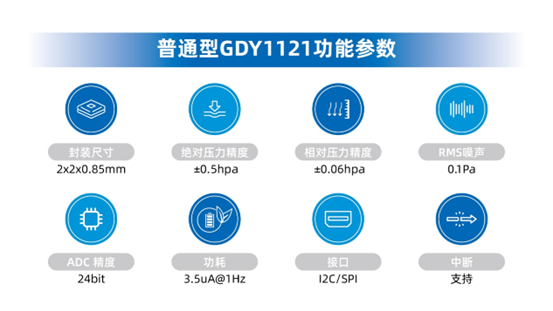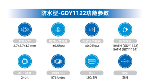 作为GDY1121的加强型,GDY1122支持10ATM防水等级,远领先于同类产品。其封装尺寸为2.7x2.7x1.7mm,绝对压力精度±0.5hPa,相对精度±0.06hPa,ADC精度达24bit。防水等级高达10ATM,能适应严苛环境。