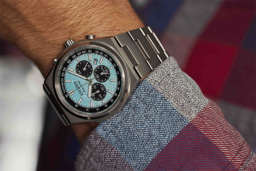 Zenshin系列的设计语言同样打破传统户外腕表的粗犷框架。光动能计时款腕表从1970年代的流行元素中提取设计灵感,棱角分明的几何线条,纹理表盘在阳光下折射出金属工艺的冷光,绿松石、三文鱼橙、珍珠白三色灵感源自春芽、落日与雪原,与当下流行的山系穿搭非常契合。3、6、9时位黑色副表盘与测速刻度圈复刻了经典“熊猫盘”,4时30分日期视窗以非常规布局增添设计巧思,搭配一体式舒博™钛表链,既可隐匿于冲锋衣袖口,亦可搭配廓形西装成为都市穿搭的吸睛细节。其搭载的Cal.B620光动能机芯通过可见光驱动实现长效续航,0.2秒精度计时器与防过度充电功能,让户外探险的时间管理精准至每一个瞬间。