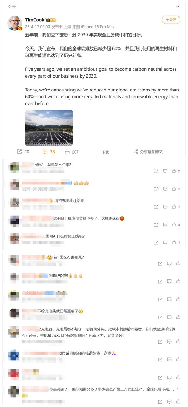 快科技4月17日消息,苹果CEO库克发微博表示,5年前我们立下宏愿:到2030年实现全业务碳中和的目标。