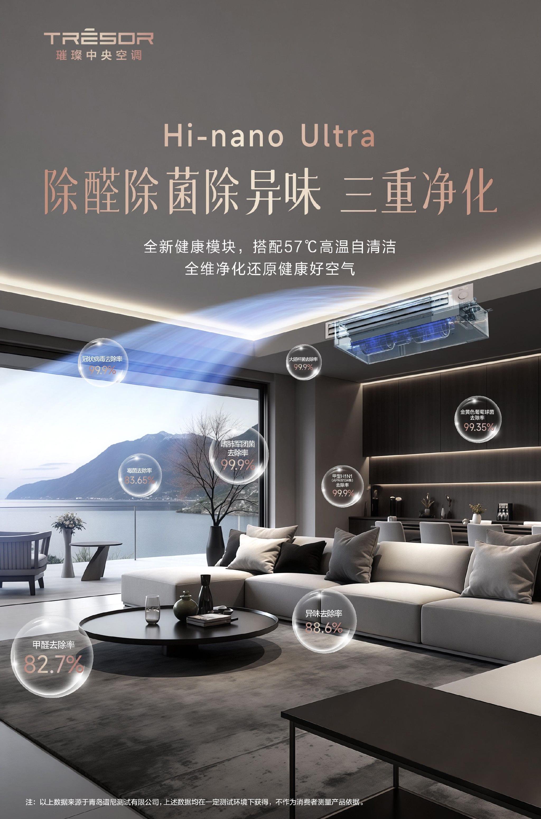 首先,璀璨借助Hi-nano Ultra健康模块,构建除醛、除菌、除异味三重净化系统,,为用户筑牢健康呼吸防线。另外,依托±0.5℃精细控温,以及40%-65%的精准控湿,“自由定制温湿度“,并可根据实际需要灵活增加新风机模块,全方位推动品质生活落地。
