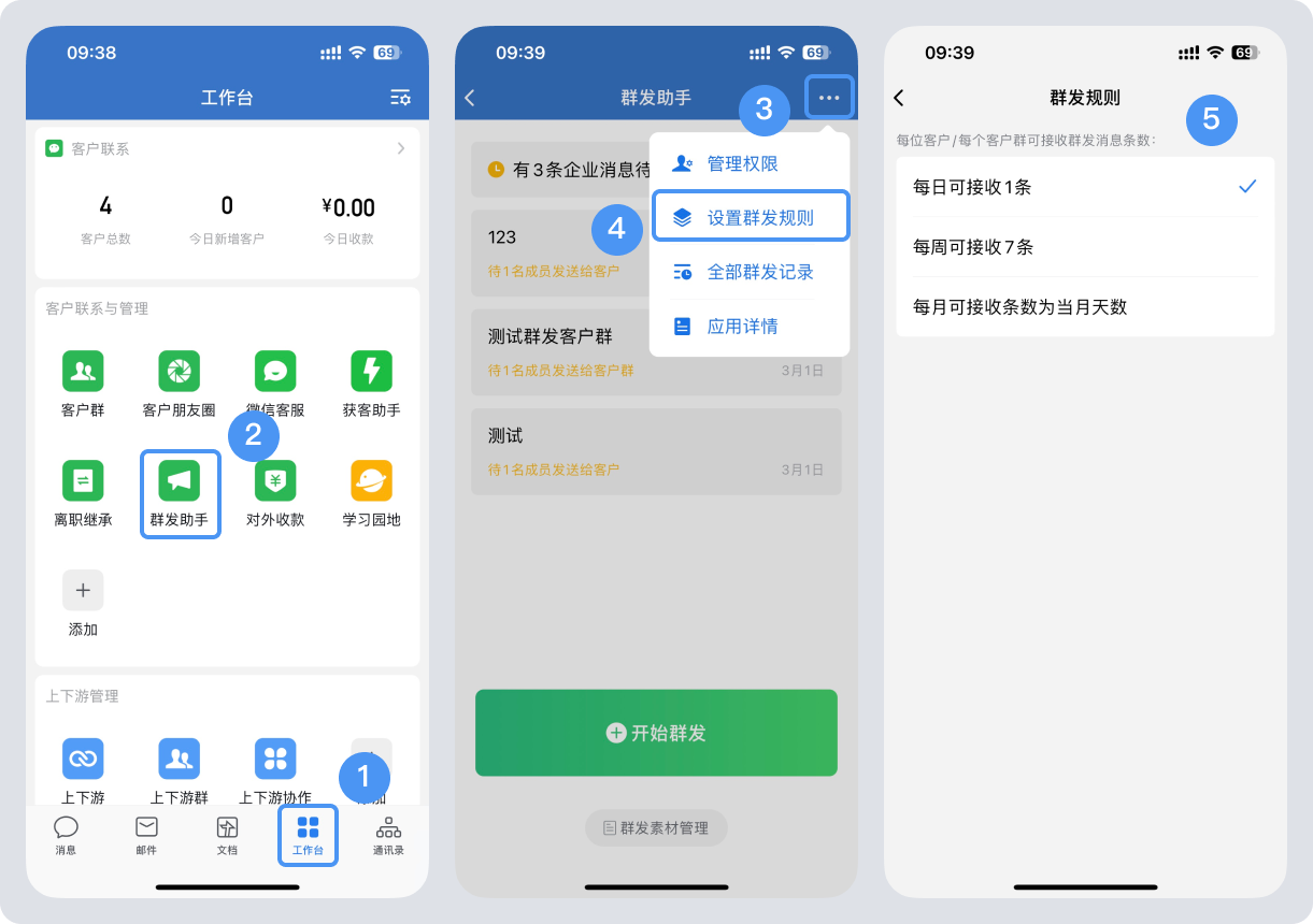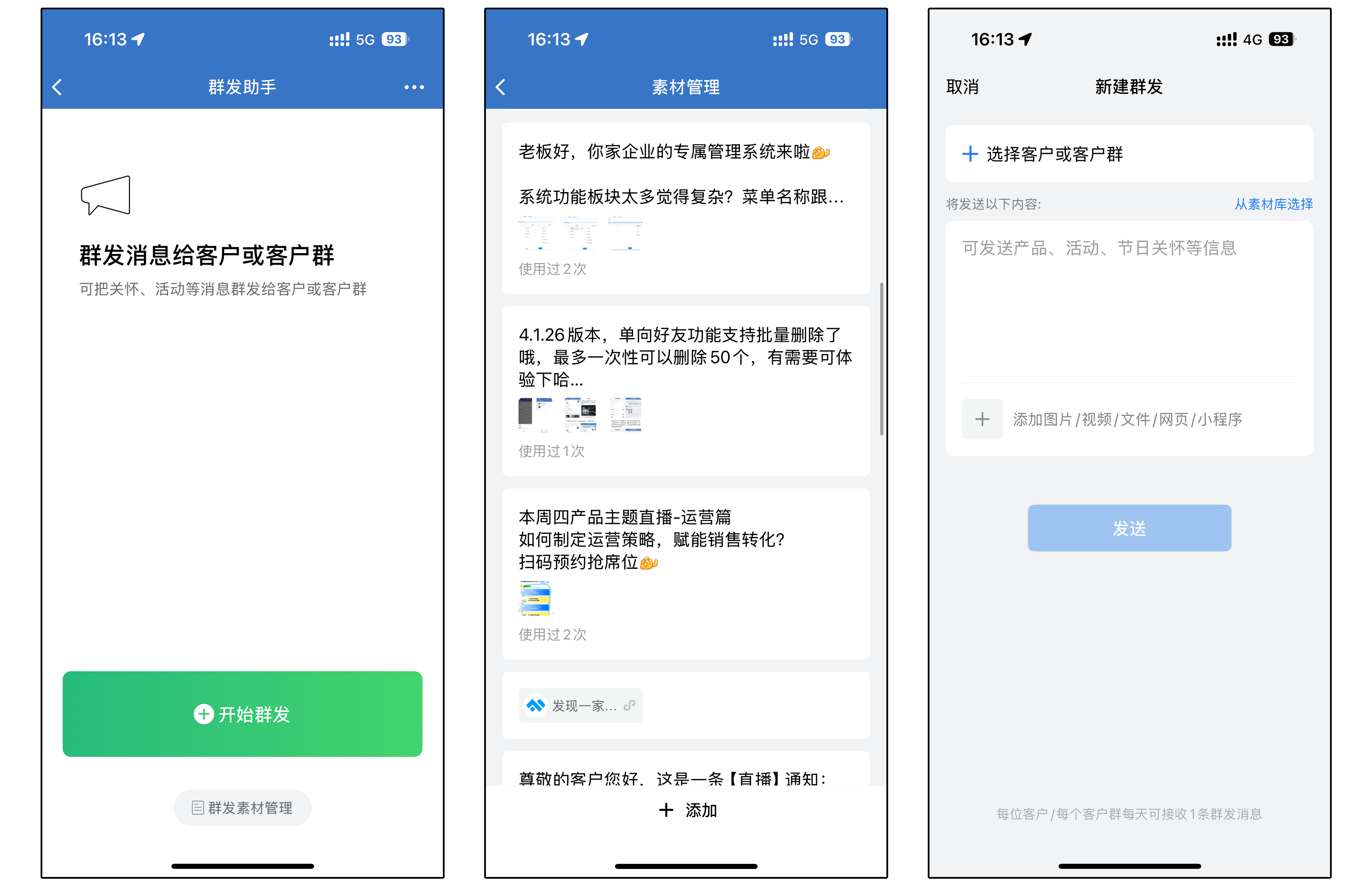 如果您是企业员工,希望批量联络客户,可以在企业微信APP端,点击【工作台】-【群发助手】进行操作,在进行群发时,既可以选择企业管理员配置好的群发内容,也可以自行编辑群发信息。