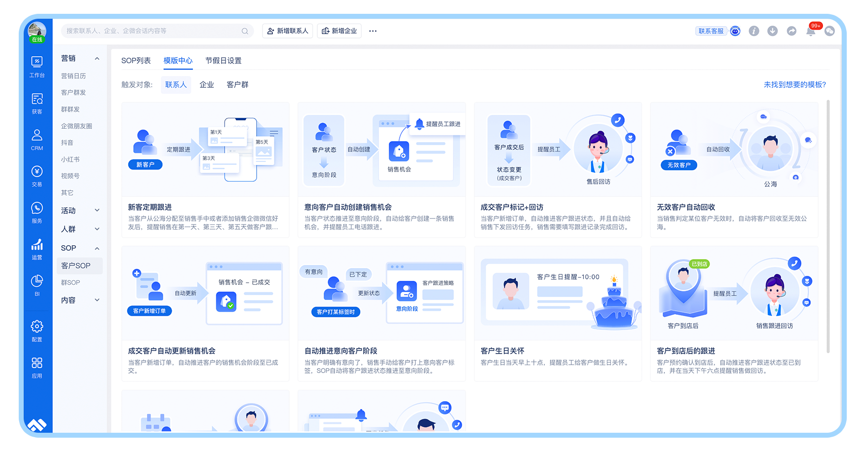 其实,企业完全通可以借助尘锋的SOP能力向销售下发群发任务,通过尘锋SOP进行客户群发触达,同样支持销售一键快速执行、回收执行数据,满足企业新客户定期跟进、客户生日回访等业务需要。