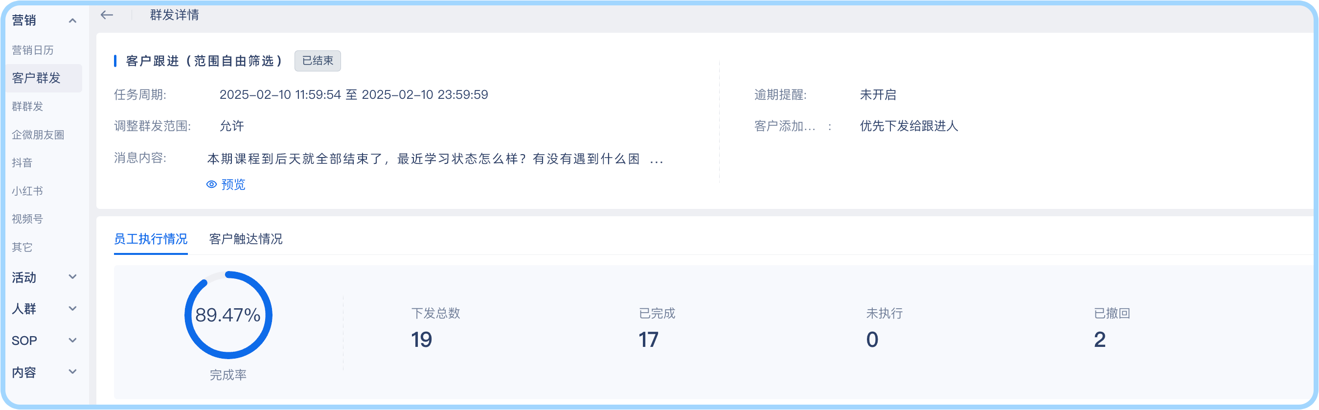 销售收到群发任务后,可以一键快捷执行,管理者还可以详细回收到销售执行的具体情况,监督销售完成客户触达任务,如果销售忘记执行群发任务,还支持二次提醒销售,确保运营效果。