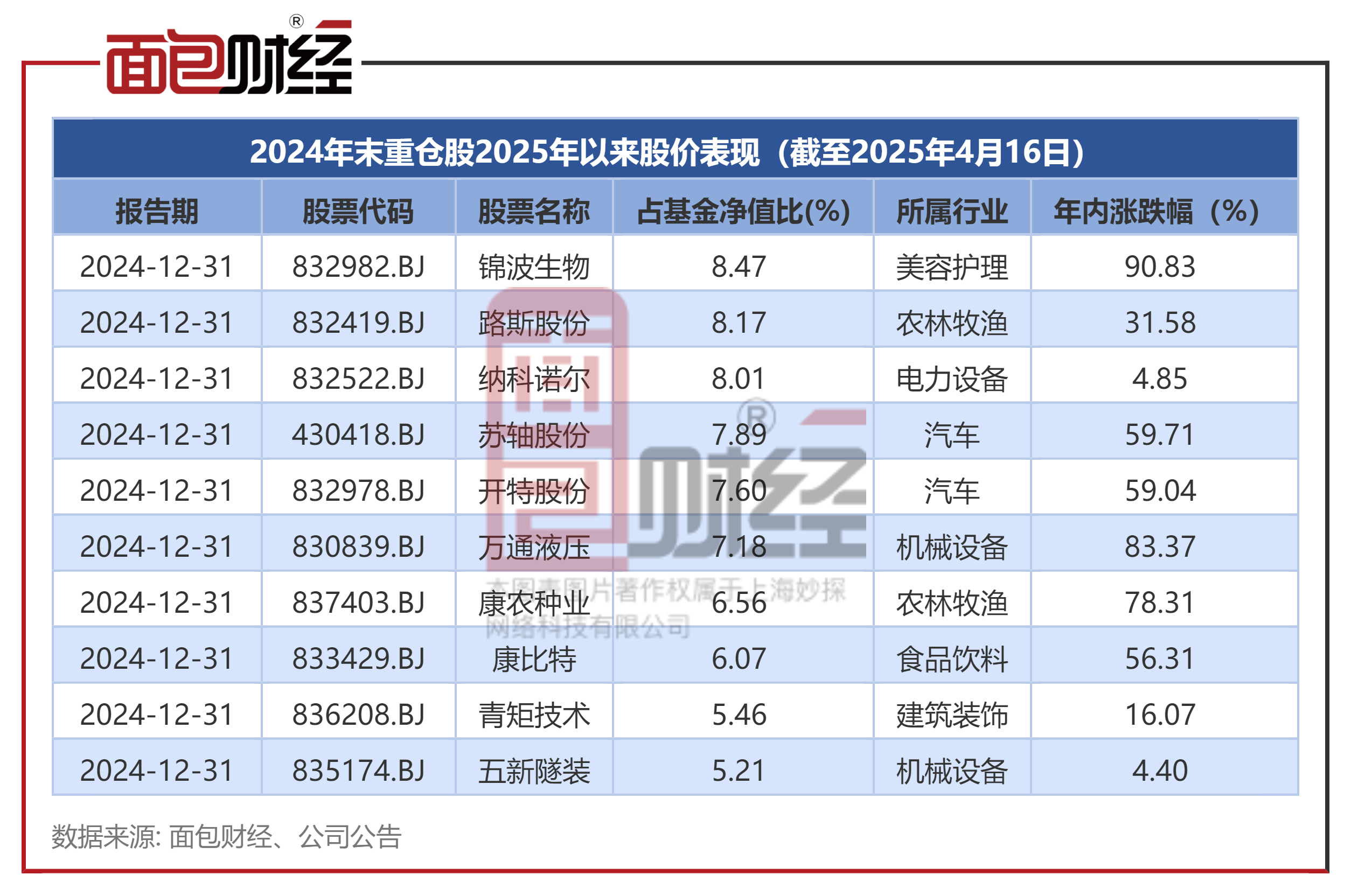 基金2024年四季度末重仓股中,超过半数股票年内涨幅超过50%,包括锦波生物、苏轴股份、开特股份等。