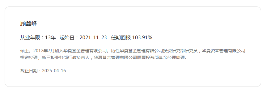 华夏北交所创新中小企业精选两年定开混合发起式的基金经理为顾鑫峰,2012 年 7 月加入华夏基金。历任华夏基金投资研究部研究员,华夏资本管理有限公司投资经理、新三板业务部行政负责人,华夏基金股票投资部基金经理助理。