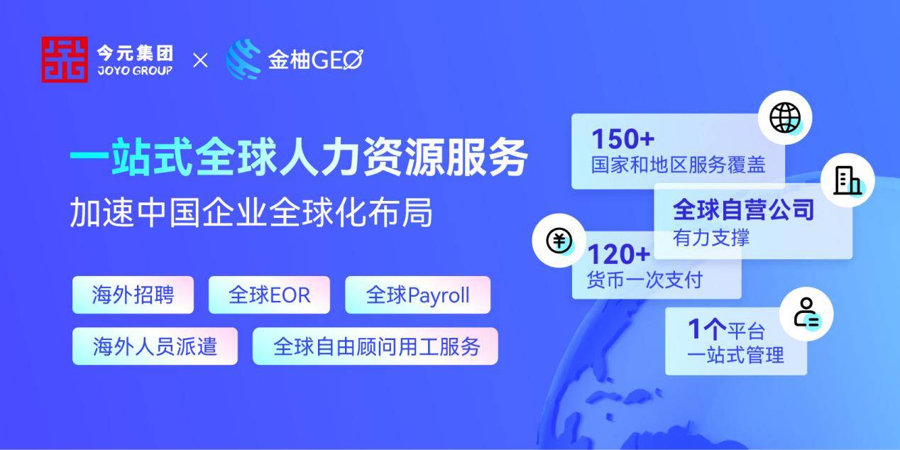 今元集团旗下的海外人力资源业务全球总部「金柚GEO」,致力于提供一站式全球人力资源服务,助力加速企业出海并实现海外业务的稳健发展。服务涵盖海外招聘、全球EOR、全球Payroll、海外员工派遣、全球自由顾问用工服务等,覆盖亚太、美洲、欧洲、中东、非洲等区域,支持150多个国家和地区的需求落地。