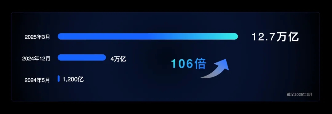 截至2025年3月底,豆包大模型日均tokens调用量已超过12.7万亿,是2024年12月的3倍,是一年前刚刚发布时的106倍。IDC报告显示,2024年中国公有云大模型调用量激增,火山引擎以46.4%的市场份额位居中国市场第一。