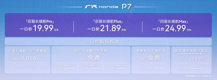 本田品牌的第二款纯电车型——广汽本田 P7 今天上市的最终的售价定在了—— 19.99 万元 / 21.89 万元 / 24.99 万元。