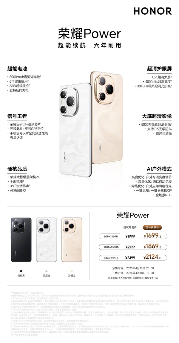 快科技4月17日消息,荣耀预告,荣耀Power将于明天首销,国补后的起售价是1699.15元。