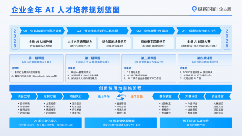 而在推进企业AI应用落地的过程中,人才培养是关键环节。司巧蕾在演讲中提到,极客邦科技推出了一套针对企业AI人才培养的系统化方案。该方案根据企业应用AI的不同阶段进行需求识别,并基于人才岗位职级实施分层赋能。同时,极客邦科技将企业全年AI人才培养规划分为四个阶段:全员认知升维、分层培养、结合业务场景实践以及部门深度学习与创新,最终通过AI创新大赛检验成果。这一流程旨在助力企业构建高效的人才培养体系,推动AI技术在企业中的落地与创新发展。
