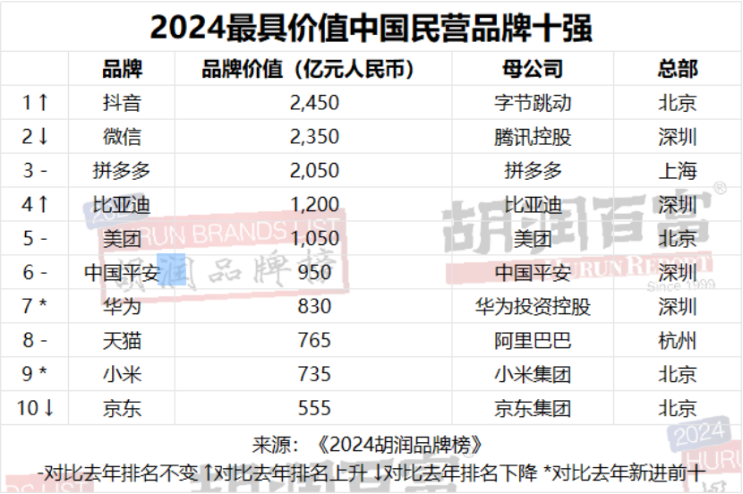 《2024胡润品牌榜》今天发布,2024最具价值中国民营品牌十强出炉。根据十强榜单,前五民营品牌的价值均超过1000亿元。其中,抖音超越微信,达到2450亿元,荣登“最具价值民营品牌”榜首。抖音品牌价值增长500亿元,成为今年价值增长最多的品牌,在2024最具价值中国品牌中排名第二,仅次于茅台。