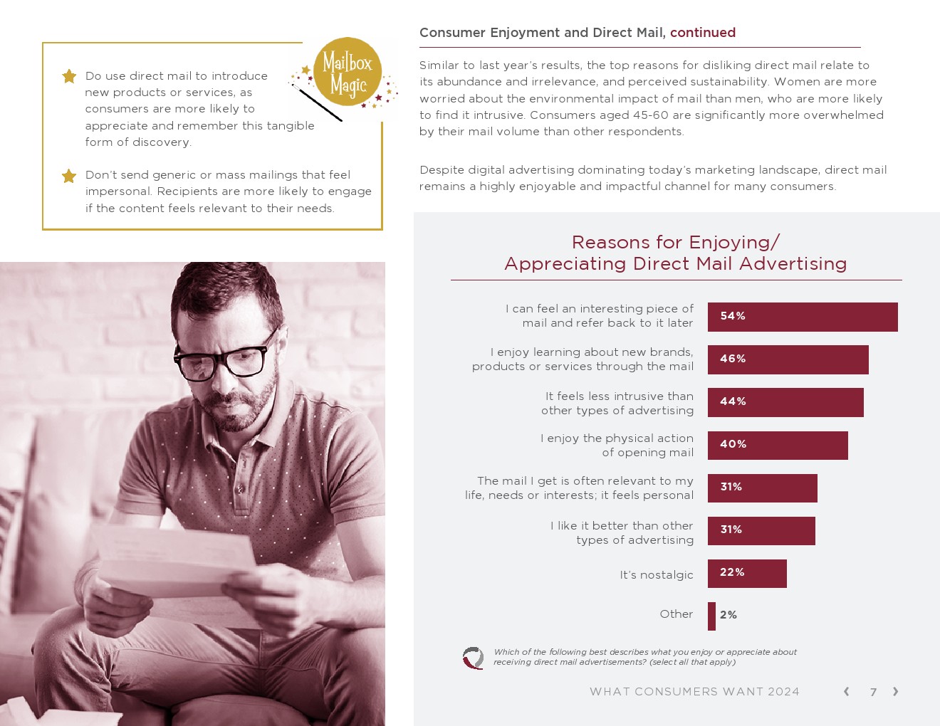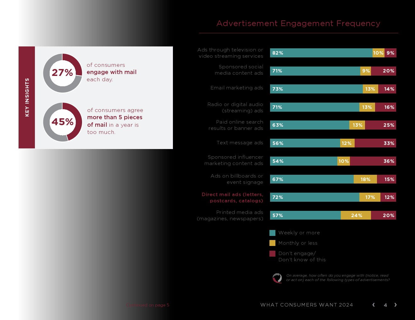 今年调查的一个突出发现是直邮作为广告媒介的持续有效性,72%的受访者每周都会使用直邮。这种参与度凸显了邮件的持续相关性,尤其是在年轻受众中。有趣的是,我们发现35%的25-44岁的消费者每天都使用直邮,这是消费者群体中参与度最高的。这表明,年轻的消费者仍然对直邮广告有反应,尤其是当它包含了与他们的需求产生共鸣的个性化或相关内容时。