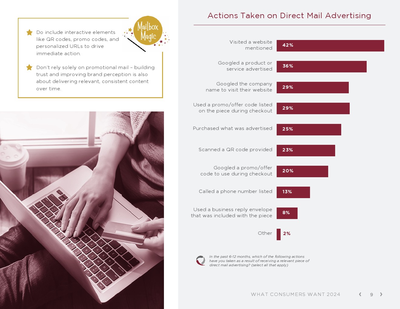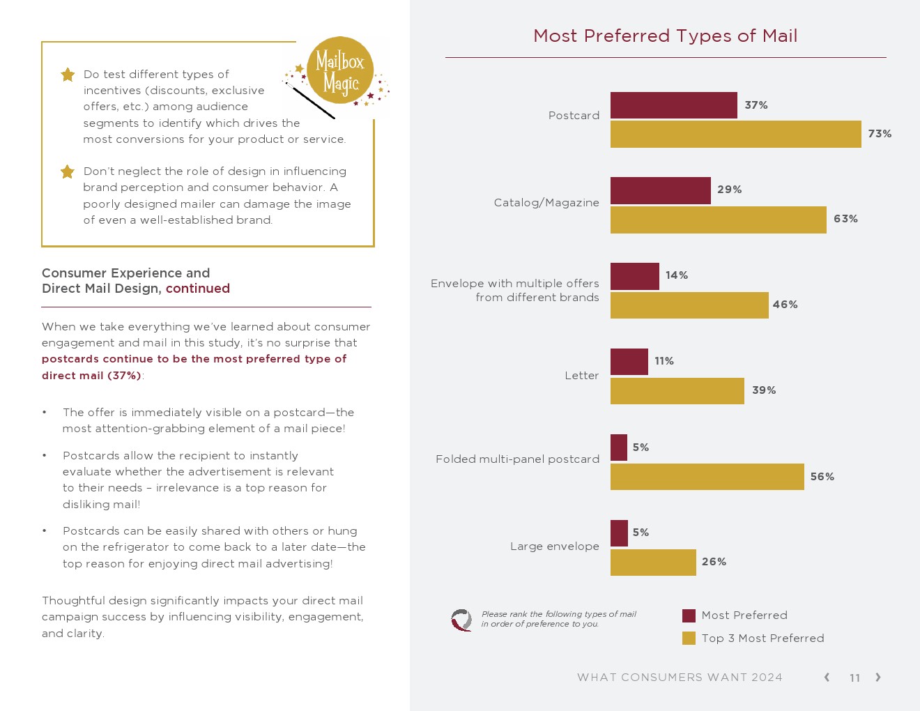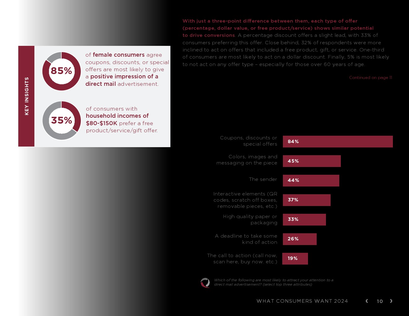 直邮设计在塑造客户体验方面起着至关重要的作用。优惠券、折扣或特别优惠仍然是直邮中最吸引眼球的方面,其次是有创意的视觉效果和发件人。