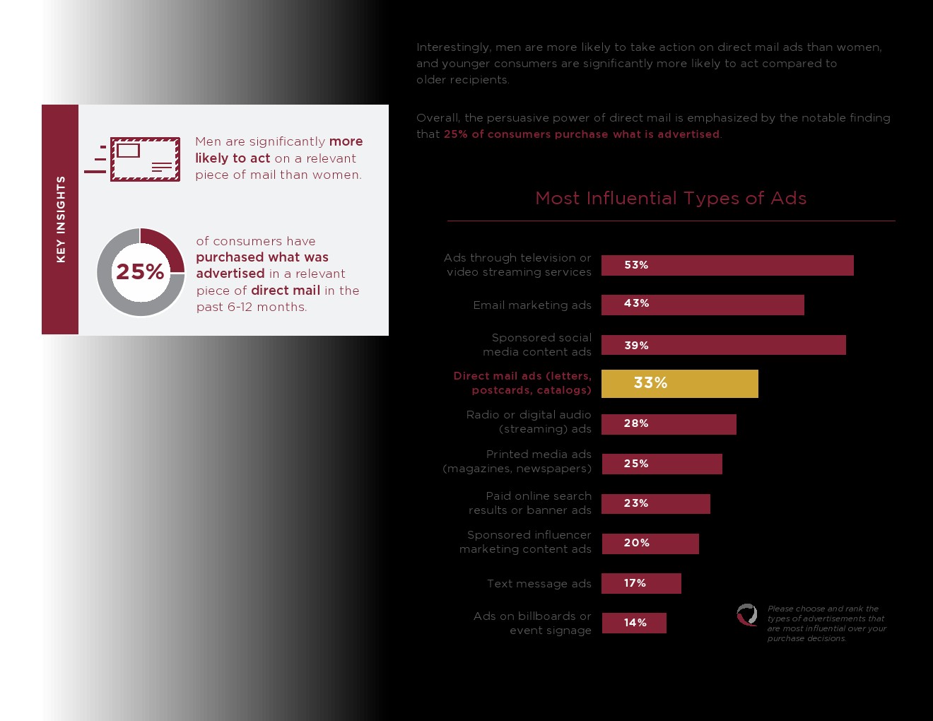 直邮继续位列四大最具影响力的广告形式之列。邮件的触觉体验会鼓励消费者花时间来评论这件作品,从而产生更强的回忆,更大的情感联系,并提高可信度。