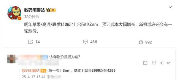 去年10月份,因高通骁龙8 Elite、联发科天玑9400芯片切入台积电3nm工艺,国产品牌集体涨价。
