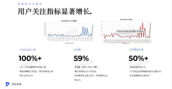 道乐科技【金舆】系统通过多角色AI助手,实现从“被动应答”到“主动服务”的运营升级。以某中型基金公司为例,接入金舆AI后,产品讨论区的用户月度活跃度增长59%(基于DAU计算),人力成本降低50%,产品日均加自选人数环比上涨108%。