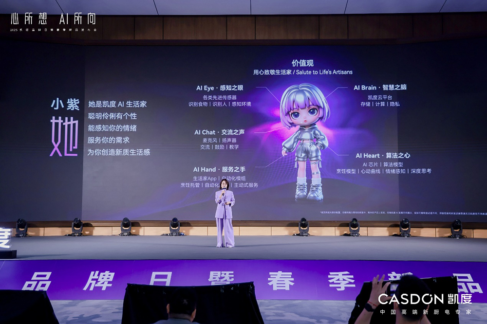 发布会的最高光时刻,属于凯度首个AI数字生命体“小紫”的登场。这个整合AI Brain智慧之脑、AI Heart算法之心、AI Eye感知之眼、AI Chat交流之声、AI Hand服务之手五大模块的数字生命体,标志着厨电从“工具”向“家人”的角色蜕变。
