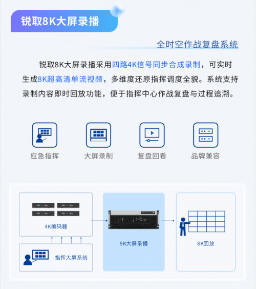 InfoComm China 2025展会期间,锐取旗下多款录播产品同步亮相,其中锐取8K大屏录播解决方案为指挥中心量身打造,可实时生成8K超高清单流视频,以8K超清显示效果满足指挥中心作战复盘与过程追溯需求,视频回放时多路视频自动实现毫秒级对齐播放、消除拼接画面问题,多维度还原指挥调度全貌。