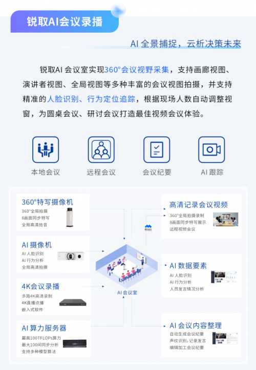 锐取全新发布的AI会议室解决方案集成360°特色摄像机、AI摄像机、AI算力服务器、4K会议录播等设备。系统支持AI声纹识别,通过AI语音转写快速生成会议纪要,参会人员发言记录分离,会议高频词精准提炼,会议内容一目了然,并且会议全过程进行AI分析,参会者行为,发言时长、次数等信息一目了然,以便管理者了解会议情况。