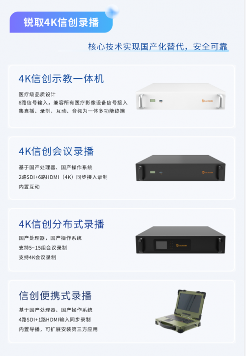 锐取4K信创录播产品同样备受关注,锐取以4K信创示教一体机、4K信创会议录播、4K信创分布式录播等设备,构建起4K信创录播产品矩阵,而且锐取已从基础硬件、基础软件、应用软件等多个核心关键部件实现国产化替代,在满足直播、录制、互动等使用需求的同时,也能确保录播信息安全可靠。