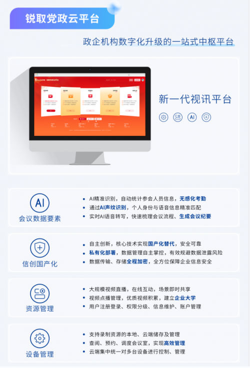 针对政企机构数字化升级,锐取党政云平台构建起一站式中枢平台,支持大规模视频直播、在线互动,线上会议期间可通过AI技术自动统计参会人员信息、AI声纹识别并匹配不同人员身份与语音信息,AI语音转写技术还能快速生成会议纪要,并且锐取党政云平台支持国产化技术配置和本地私有化部署,有效规避数据泄露风险,真正做到专业高效。