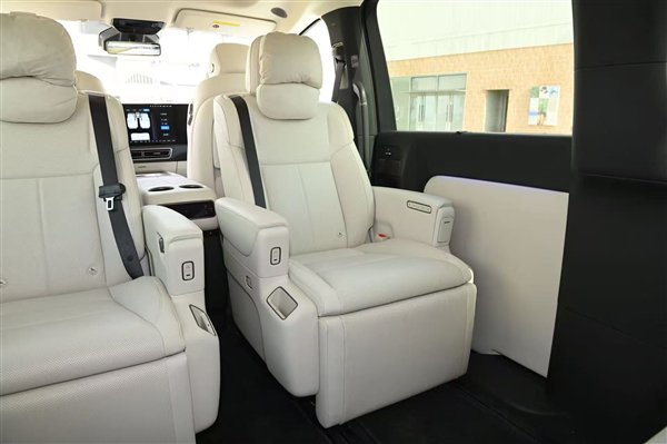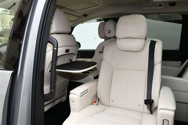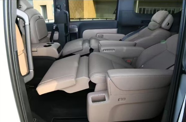 相较于普通版,家庭特别版最大的亮点就在于第二排座椅,可以看到其依旧为独立航空座椅,配有电动腿托,可大幅度向后仰,达成类似零重力的状态,但由于对前排空间造成侵占,目测该功能仅支持驻车状态下使用。