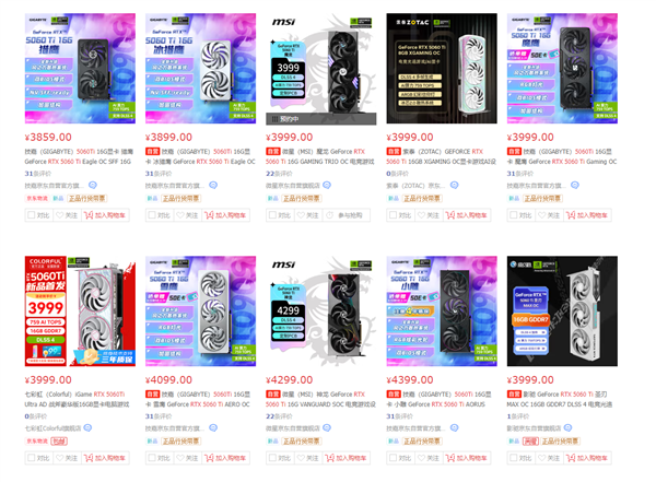 在国内,RTX 5060 Ti同样是16GB销量明显更好,8GB乏人问津,不过价格还是稍微有些高,官方渠道内16GB基本都在4000元左右,8GB 3500元左右,而建议零售价分别是3599元、3199元起。