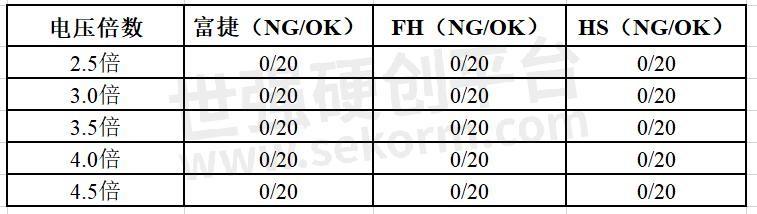 在4.5倍额定电压下,富捷电阻的NG(不合格)数为0,OK(合格)数为20,与知名品牌FH和HS的表现一致。这表明富捷电阻在过负荷能力上与这些知名品牌处于同一水平,完全能够满足高负荷应用场景的需求。这种卓越的过负荷能力意味着富捷电阻可以在短时间内承受更高的电压和电流冲击,而不会出现性能下降或损坏的情况。这对于一些需要高可靠性的应用场景,如汽车电子和工业控制等领域,具有重要的实际意义。