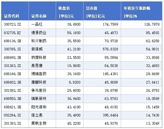从二级市场表现看,截至4月17日收盘,今年以来,已有一品红、德源药业、科兴制药、新诺威、纳微科技、泰恩康、博瑞医药、康鹏科技、争光股份、瑞联新材、阳光诺和、信立泰、昊帆生物等13只个股涨幅超过10%。