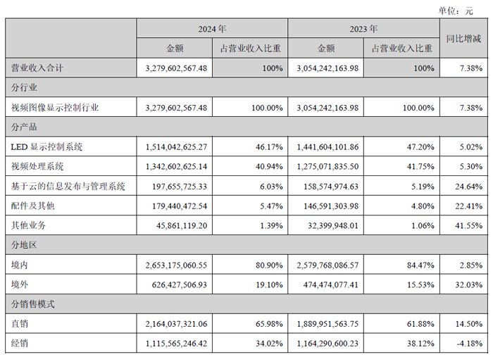 分产品看,LED显示控制系统业务实现营收15.14亿元,营收占比46.17%,同比增长5.02%;视频处理系统业务实现营收13.43亿元,营收占比40.94%,同比增长5.30%;基于云的信息发布与管理系统业务实现营收1.98亿元,营收占比6.03%,同比增长24.64%;配件及其他业务实现营收1.79亿元,营收占比5.47%,同比增长22.41%。