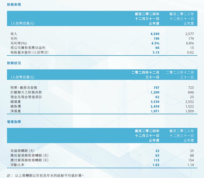 回顾期内,在销售的大幅增长带动下,本集团录得毛利达人民币196.3百万元,同比增加12.8%,毛利率为4.3%。除业务规模扩大外,本集团自衍生金融工具(如用于对冲本集团外币风险的远期货币合约)之变现亏损减少约人民币50.0百万元获益。因此,本集团录得母公司拥有者应占溢利达人民币66.0百万元,同比增加404.2%。