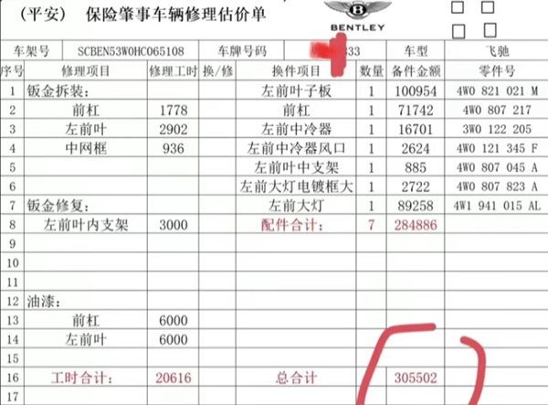 但由于宾利欧陆是300多万的奢华车,所以定损大概率不会便宜,在评论区有网友晒出了类似的事故定损单,配件+工时,最终花了30多万。