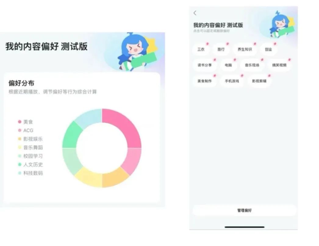 哔哩哔哩:用户可通过【设置-隐私权限设置-个性化内容推荐管理】进入“我的内容偏好”版块,通过偏好分布饼状图直观地感受自己目前的“信息茧房”程度。在此版块中,用户也可以自主管理自己的个性化标签。