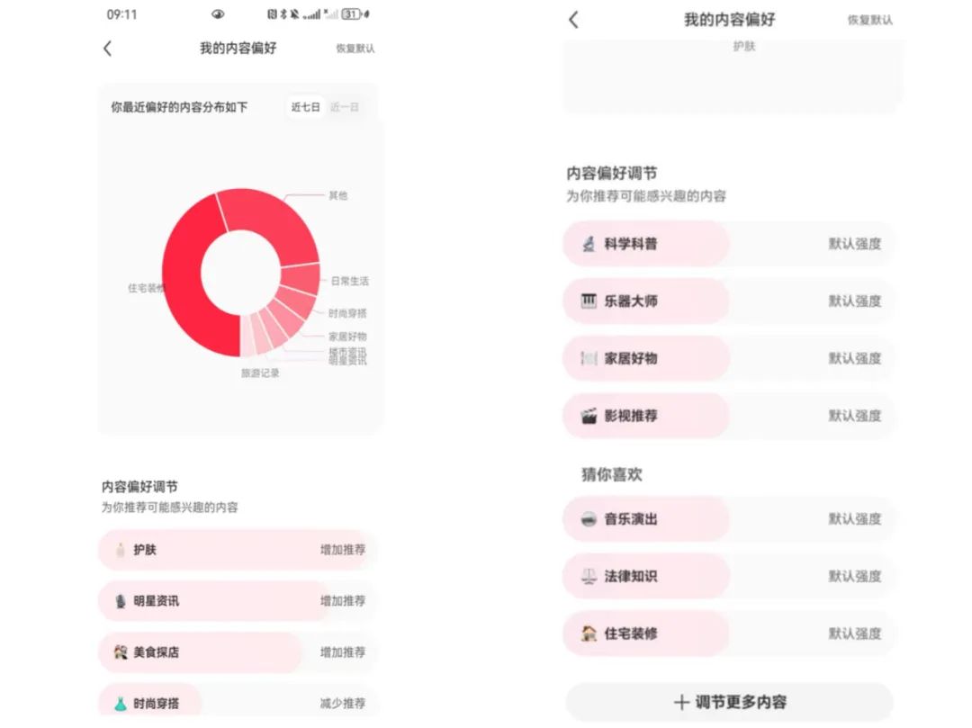 小红书:用户可通过【设置-内容偏好调节】进入“我的内容偏好”版块,查看近七日和近一日的偏好内容分布情况饼状图。在此版块中,用户还可自主调节内容偏好,选择自己喜欢的内容领域。