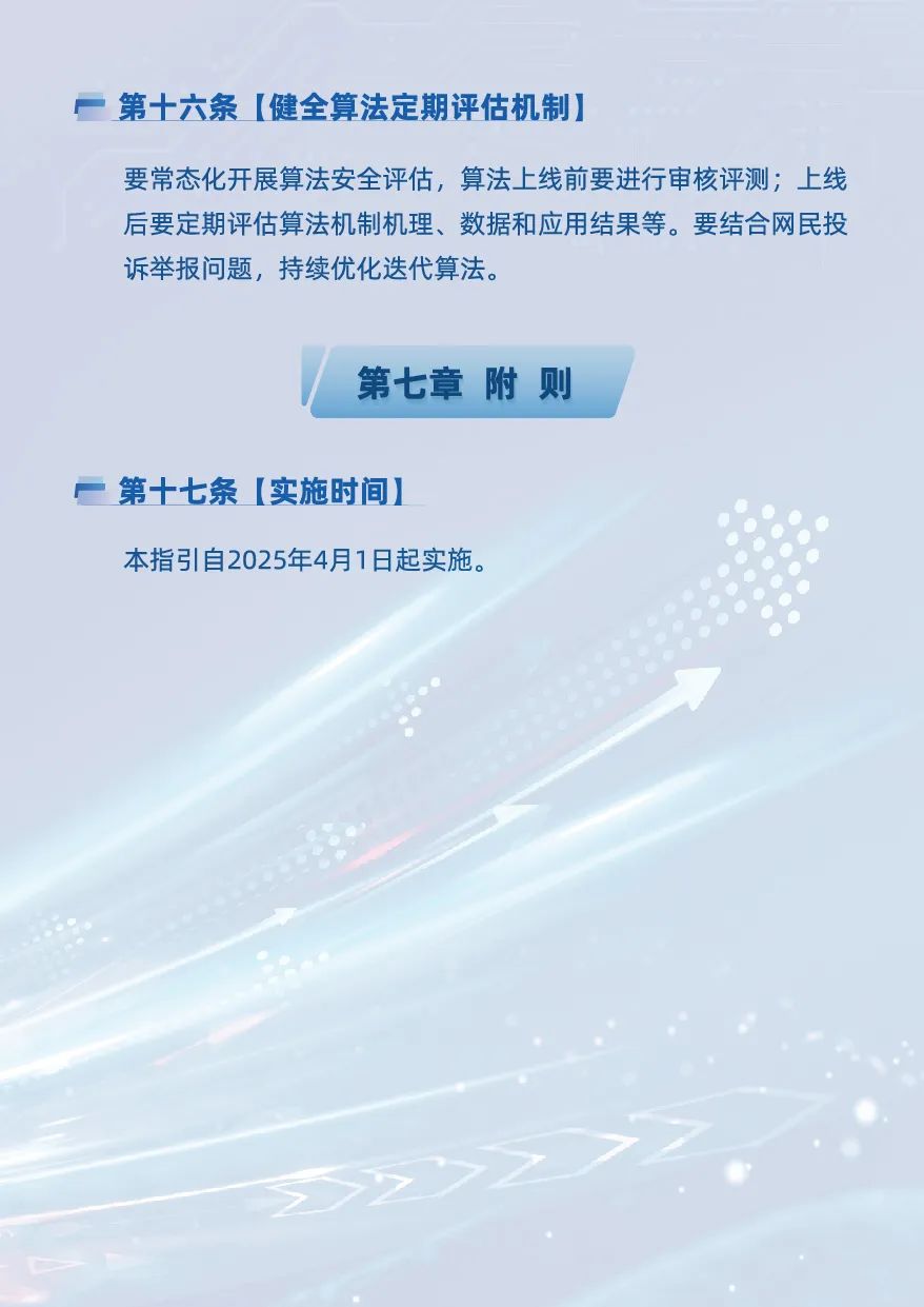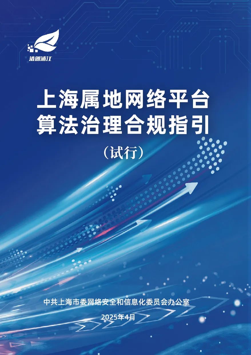 为巩固专项治理成果,加强业务合规指导,近期上海市委网信办结合工作实际,会同上海互联网应急中心编写了《上海属地网络平台算法治理合规指引(试行)》(下称《指引》,全文详见以下滑动图片),并于2025年4月1日正式实施。