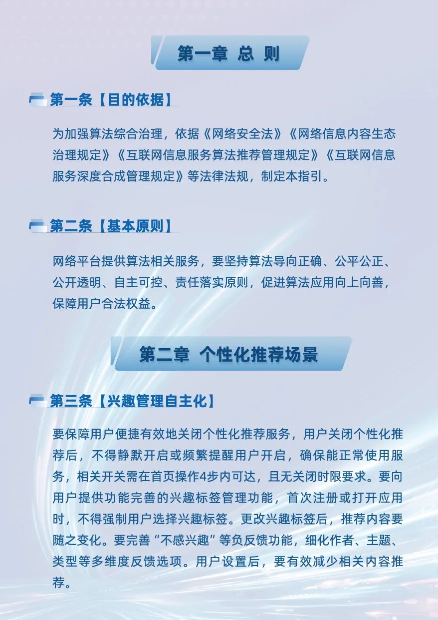 个性化推荐场景中,《指引》聚焦“兴趣管理自主化、推荐内容清朗化、标签体系精细化”三个方向,明确要求平台清晰提示用户4步操作内可便捷关闭个性化推荐,为用户提供“不感兴趣”按钮、兴趣标签管理功能,把“算法开关”交到用户手中;引入更多正向合规指标,构建科学的流量分发机制,积极传播优质内容、抑制负向内容,进一步提升推荐内容的多样性丰富性。