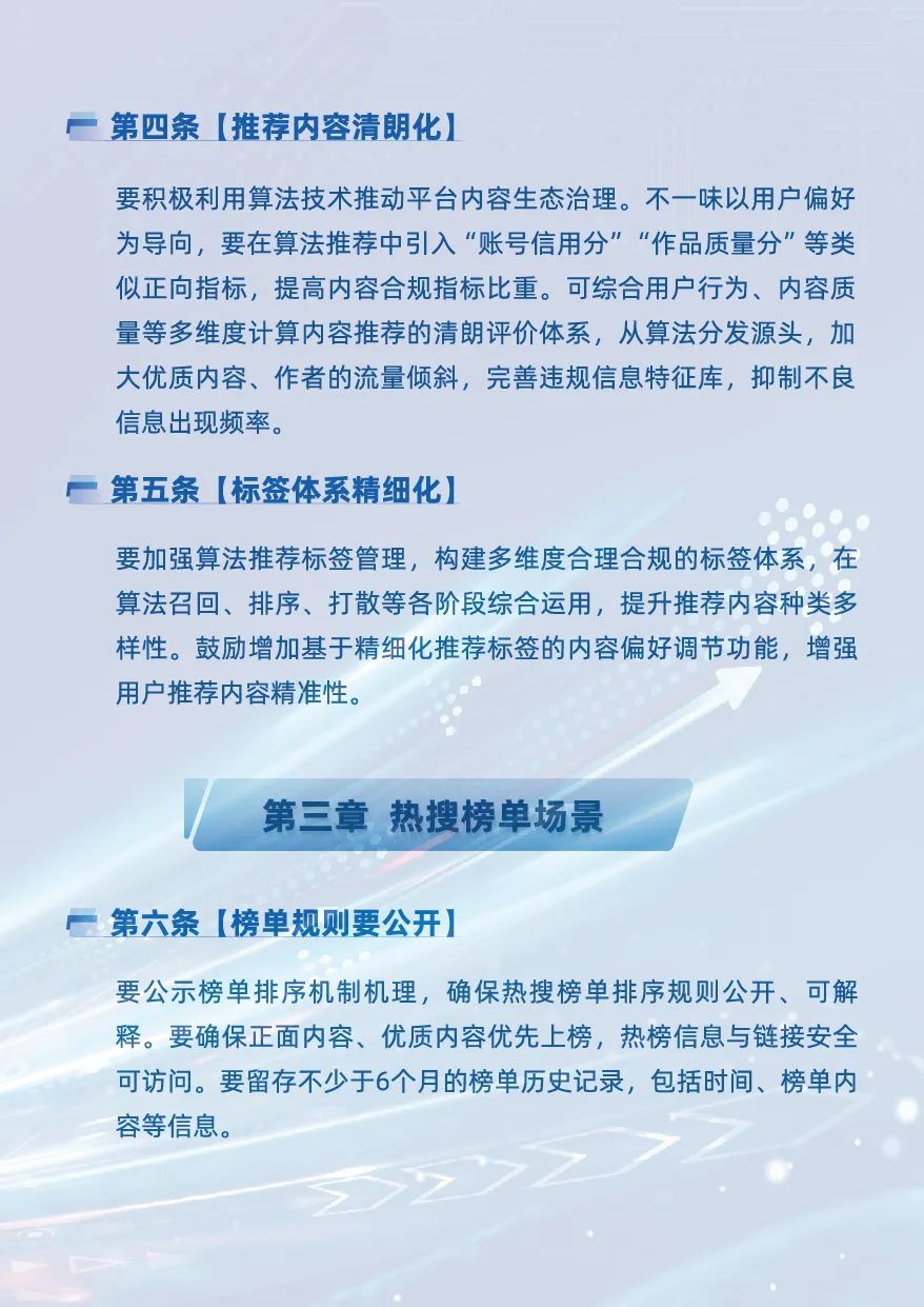 热搜榜单场景中,《指引》提出“榜单规则要公开、刷单行为要管控、榜单呈现要优化”三方面指导意见,明确要求平台通过显著位置公示热搜榜单排序原理,提升榜单透明度和可解释性;借助技术手段,及时处置水军刷榜等异常行为,维护榜单公正;加强榜单内容管理,减少不良导向内容上榜,防范使用不文明语言。