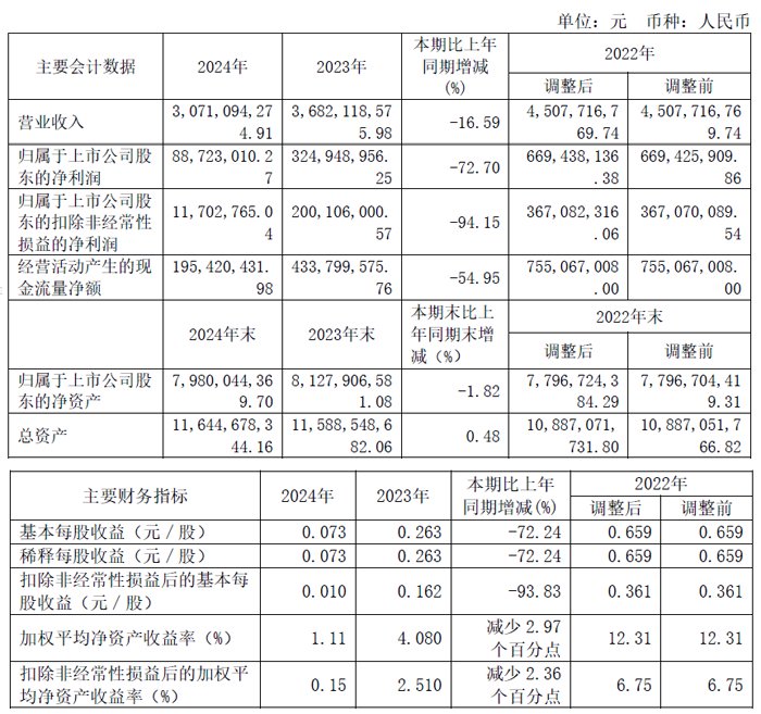 4月18日,天通控股股份有限公司发布2024年年度报告。报告期内,公司实现营业收入30.71亿元,较上年同期减少16.59%;归母净利润0.89亿元,较上年同期减少72.70%;扣非净利润1,170.28万元,较上年同期减少94.15%。截至2024年末,公司总资产116.45亿元,归属于上市公司股东的净资产79.80亿元,资产负债率30.71%。