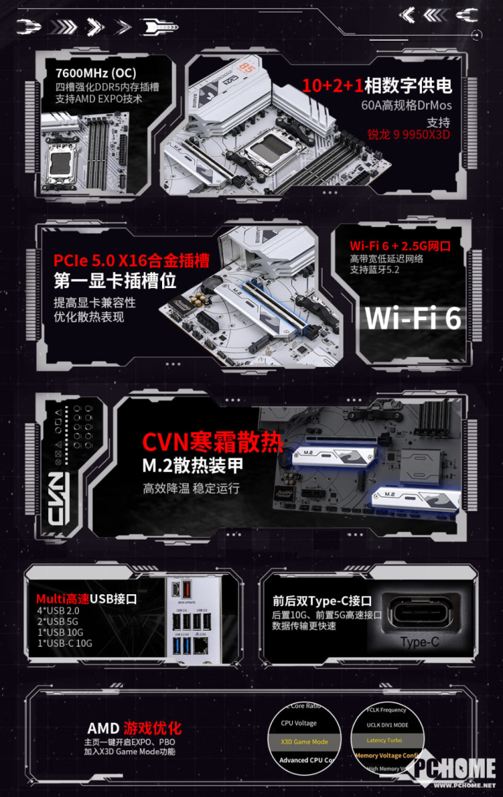 CVN B850M GAMING FROZEN V14主板采用Micro-ATX规格设计。供电方面采用10+2+1相供电设计,使用60A高规格Dr.MOS,采用8+4Pin供电接口。主板采用8层PCB,供电部分覆盖寒霜合金散热装甲。提供了四条DIMM内存插槽,最高支持DDR5-7600+(OC)以及最大192GB容量,支持Intel XMP和AMD EXPO技术。配有一条PCIe 5.0 x16全长插槽和一条PCIe 4.0 x1插槽,其中全长插槽采用了合金强化处理,坚固耐用。存储方面提供三个M.2插槽,其中两个为PCIe 5.0 x4通道,另外一个是PCIe 4.0 x4通道,均支持M.2 2242/2260/2280规格,其中两个插槽配有寒霜M.2散热装甲;还有四个SATA III接口。