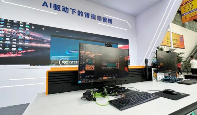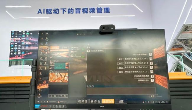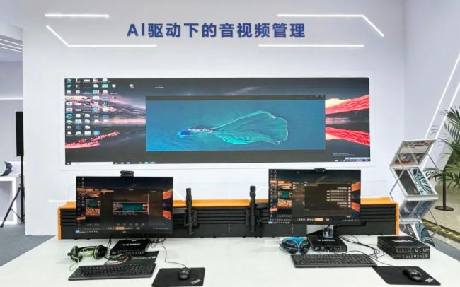 在AI 驱动下的音视频管理展区, 值得一提的是,这是本次展会创新亮点,特别展出了私有化部署DeepSeek大模型 + AI智能化协作系统的展示,对IP化音视频系统的智能化管控方案。借助私有化部署DeepSeek大模型的强大能力,实现了轻量化部署与管理运维,借助AI智能化协作系统实现语音视频对话及本地多席位的协作管理应用。