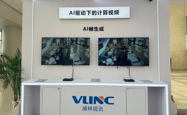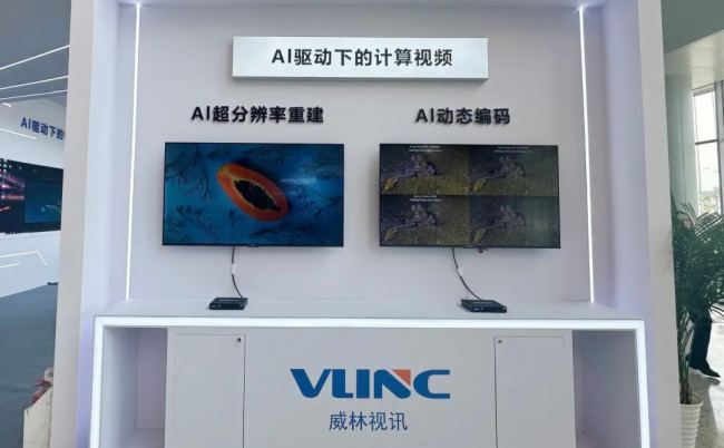 在AI 驱动下的计算视频展区,展示了AI帧生成、AI超分辨率重建及AI动态编码技术,AI帧生成有效的将低帧率视频实时插帧至60帧或者更高,在不改变原始画质的前提下,增强画面流畅度与细节变现力。AI超分辨率重建技术,将2K视频智能提升至4K及以上,适配超高清显示需求,AI动态编码技术基于深度学习与自适应网络感知算法,实时分析视频内容特征、网络状态及终端性能,动态优化编码参数,生成低码率、高画质、低延迟的视频流,为跨域互联、多终端适配、弱网传输等场景提供颠覆性解决方案。