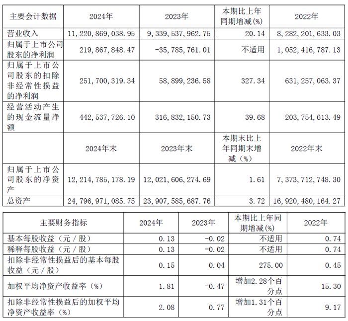 4月19日,杭州士兰微电子股份有限公司发布2024年年度报告。2024 年,公司营业总收入为112.21亿元,比2023 年同期增长20.14%;公司营业利润为10,073 万元,比2023 年增加亏损5,196 万元;公司净利润为-2,386 万元,比2023 年减少亏损4,070 万元;公司归母净利润为21,987 万元,比2023 年增加25,565 万元;公司实现扣非净利润25,170 万元,比2023 年增加327.34%。
