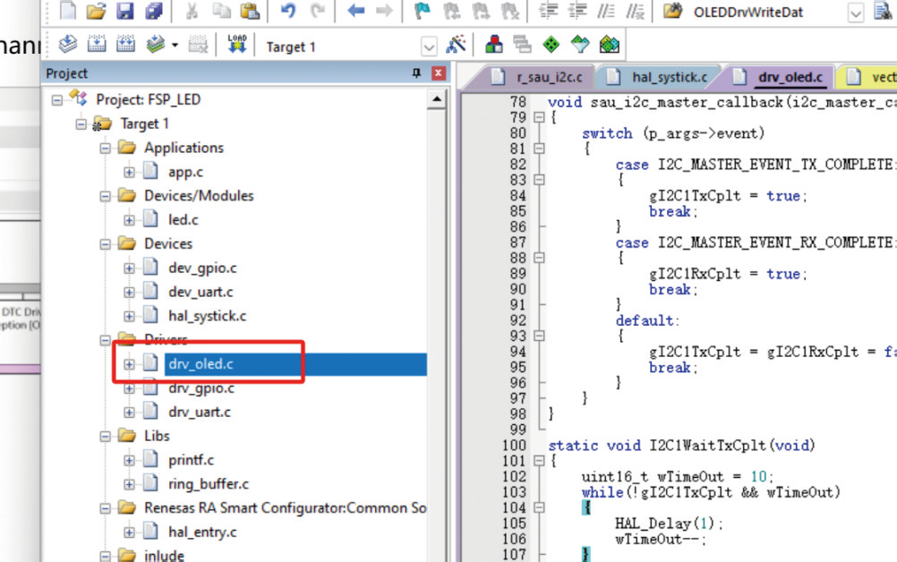 3.在原来的OLED工程之中,是使用spi来驱动的,同时原来的RA5他的内存与频率相比RA0要高很多,需要进行很多的更改。首先添加回调函数,回调函数中判断接收状态,并更新: