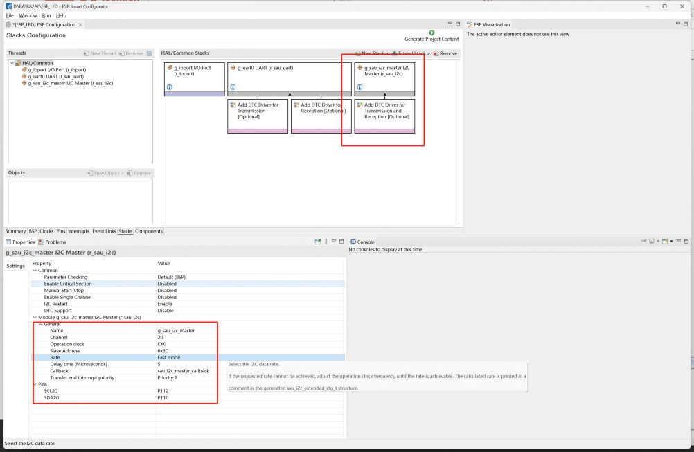 1.配置IIC,打开RASC后,在栈中增加rau_master_I2C,并设置channel为0b20即通道2,选择SCL为P112与SDA为P110。